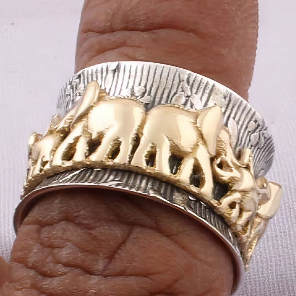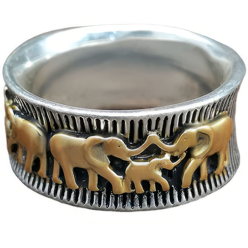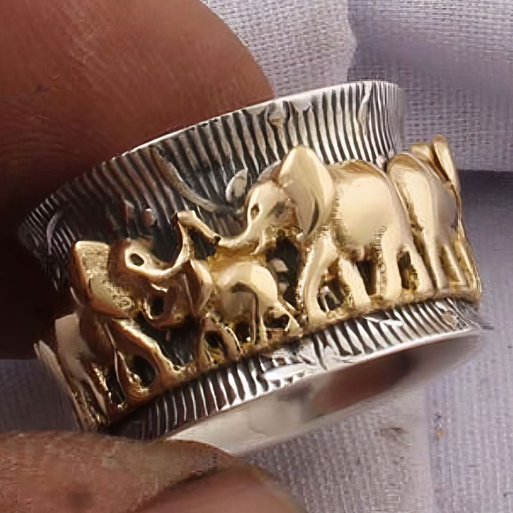 Dans ce cercle d’argent bruni et de laiton doré, une scène attendrissante : trois éléphants en marche, un petit encerclé d’amour parental. Leurs trompes s’enlacent comme des bras protecteurs. Leurs pas miniatures racontent des kilomètres de mémoire. Chaque éléphant est un totem. L’un incarne la force tranquille, l’autre la sagesse transmise, le troisième — minuscule et prodigieux — incarne le renouveau, la promesse. Le fond noirci du métal creuse la perspective, fait ressortir le relief mordoré de ces géants miniatures, et évoque la terre brûlée d’un coucher de soleil sur le Masaï Mara 🌅. Le contraste est saisissant, presque solennel. Cette bague, large, texturée, se porte comme un cri doux de loyauté, comme une promesse silencieuse, une veillée ancestrale autour d’un feu.